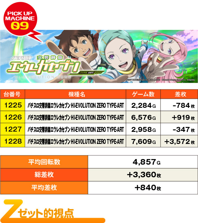 怪しい雰囲気を醸し出していた『パチスロ交響詩篇エウレカセブン HI-EVOLUTION ZERO TYPE-ART』だが、1228番台以外の3台は微妙な結果に。特にマイナスの2台は総ゲーム数不足で、全台系だったかの判断は難しい…。