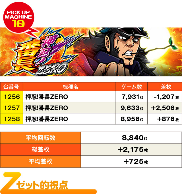 やはり今回も『押忍!番長ZERO』コーナーに優秀台並びっぽい箇所あり。3台ともに挙動自体は悪くなかったようだが、両脇の2台は思うような結果とはならず…。