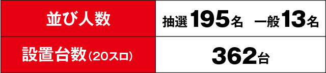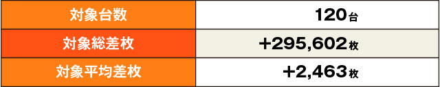 この日の対象台数は驚異の120台!この店の20スロは計362台なので、実に3台に1台が対象台だったことになる。その結果、パチスロコーナーはとんでもない数のプラス台で溢れ返ることに。その背景にはいつもの優秀台並び・全台系・ニブイチ・単品の仕掛けがあったことを付け加えておく。