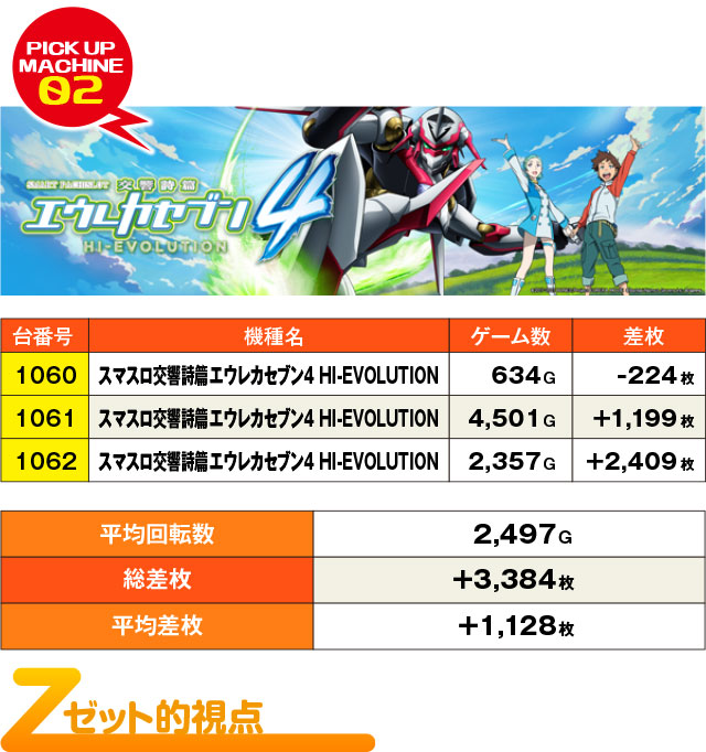 6台設置の『スマスロ交響詩篇エウレカセブン4 HI-EVOLUTION』で、ぱちタウン取材班はこの3台の動向に注目。1061・1062番台の伸びに優秀台の可能性アリ。1060番台は回されてないが、REAL取材Zの日なので3台並びだったのかも。