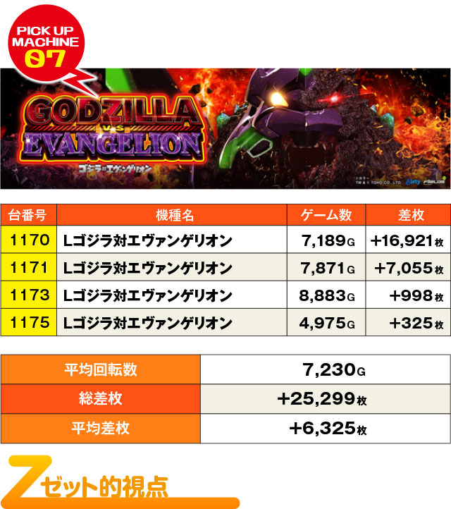 8台設置の『Lゴジラ対エヴァンゲリオン』の中で、この4台が並びでプラス。注目は+16,000枚オーバーの大偉業を達成した1170番台、そして何気に+7,000枚を上回っていた1171番台だろう。