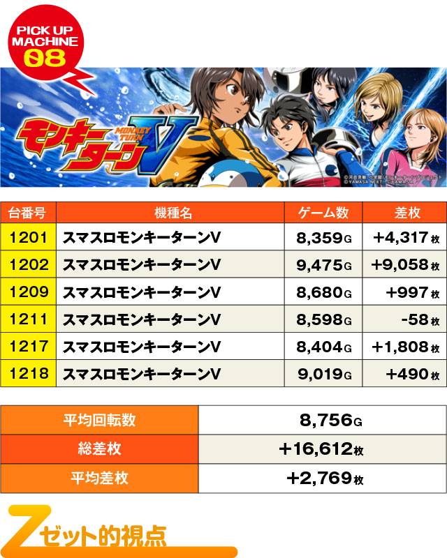 『スマスロモンキーターンV』は計12台設置だが、この6台が順当に当たり続けていた。中でも1202番台の勢いが凄まじく、周囲にもプラス台が多かったことから、もしかしたらニブイチだったのかも…?