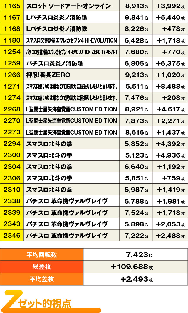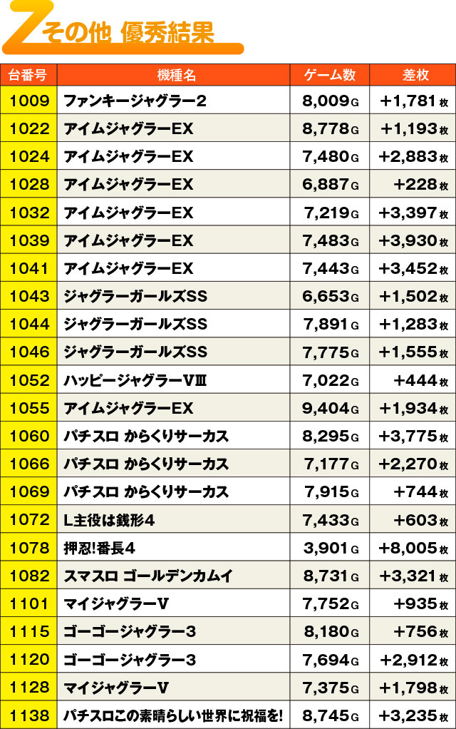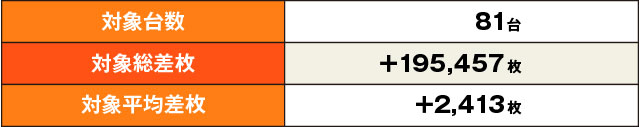いつもと同じく、この日も大量の優秀結果が誕生。並びではなく単品でもこれだけの優秀レコードが生まれていたのは嬉しい限り。人気機種には複数の優秀台があったのが見て取れる。