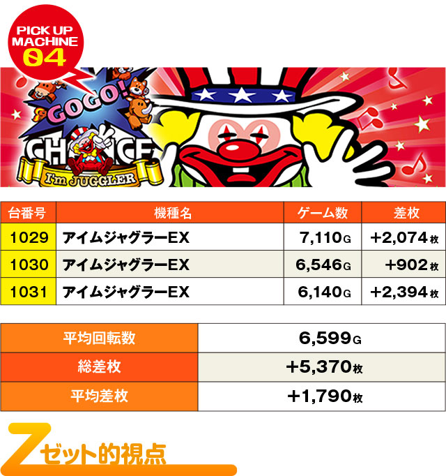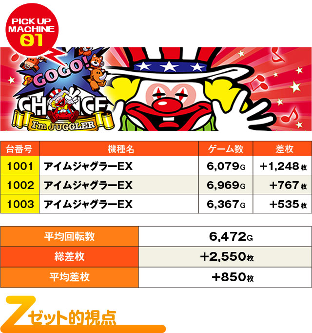 まずはいつも通り、『アイムジャグラーEX』から…とぱちタウン取材班が調査を開始したところ、さっそく優秀台並びっぽい3台を発見。3台とも差枚結果自体は控えめだが、3台並んでプラスという結果はREAL取材Zの日において疑念を抱くに十分な結果だ。