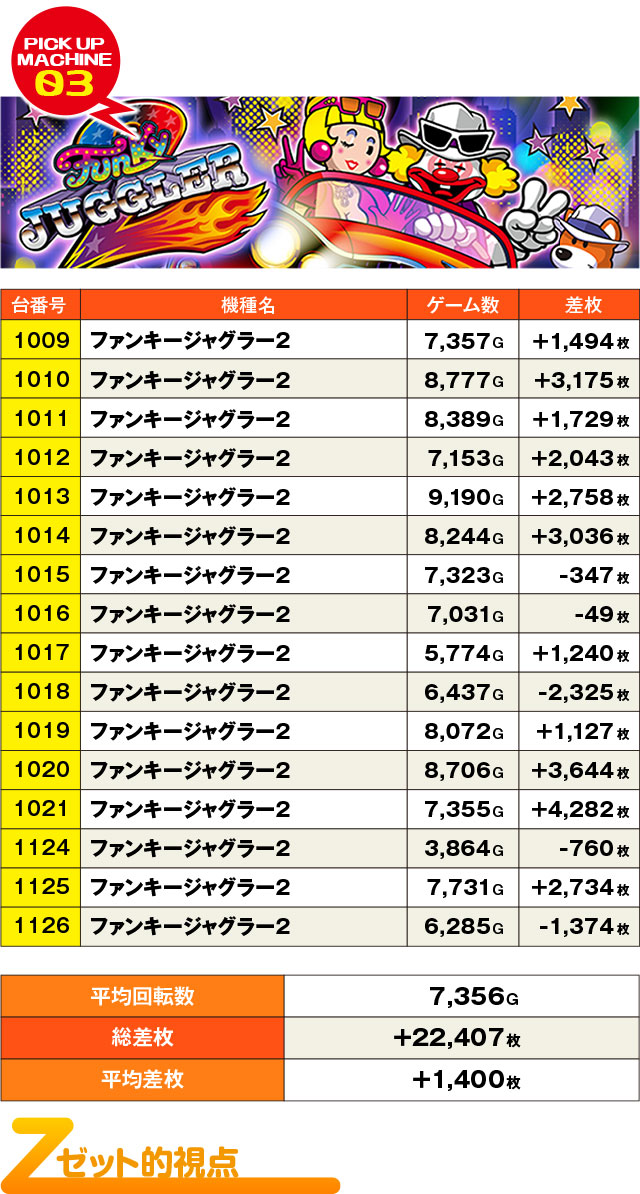 ぱちタウン取材班が驚かされたのは16台設置の『ファンキージャグラー2』コーナー。なんと13台並んで好挙動を見せていたゾーンに加え、3台並びもあり。これだけ+2,000枚超え記録が生まれていたのは、全台系だったから…!?