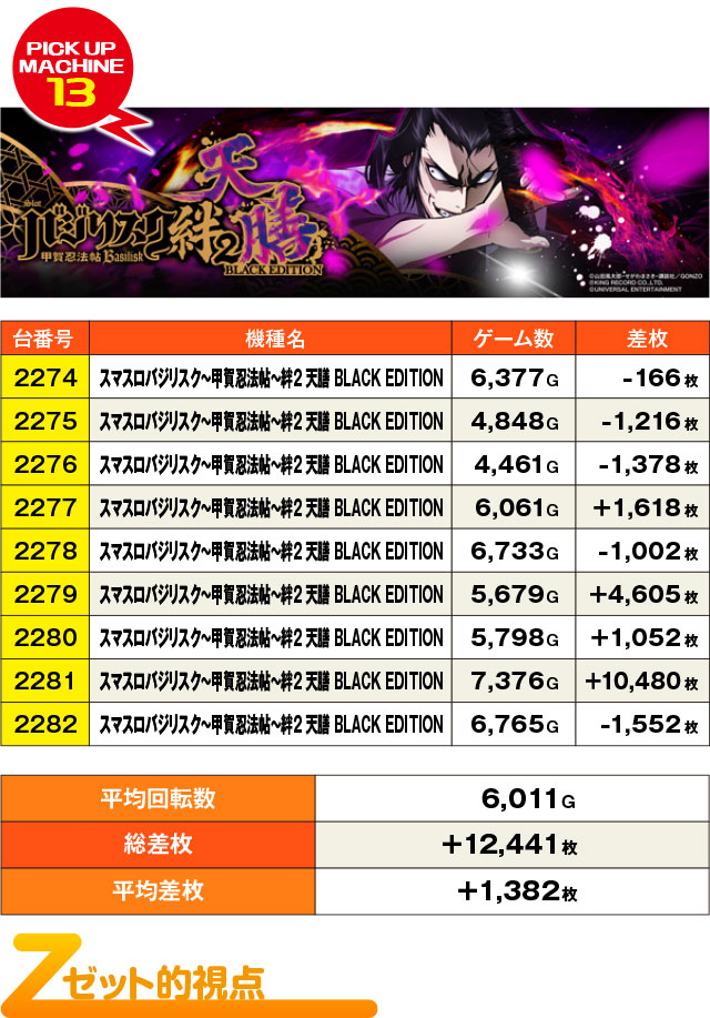 9台設置の『スマスロバジリスク~甲賀忍法帖~絆2 天膳 BLACK EDITION』の勝率は4/9台。そこまで高い勝率ではなかったが、2281番台から+10,000枚オーバー台が出現するなど見どころも十分。それなりに優秀台が潜んでいた気がするが…。
