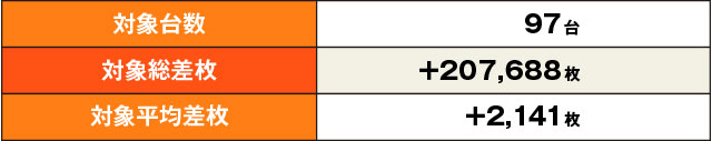 これまでと同じく、単品でも多くの優良レコードが誕生した今回。さまざまな機種から3,000枚を上回る差枚結果が生まれており、人気機種ほどその台数が多かったようだ。やはり人気マシンには優秀台が多めに潜む傾向があるのだろうか。