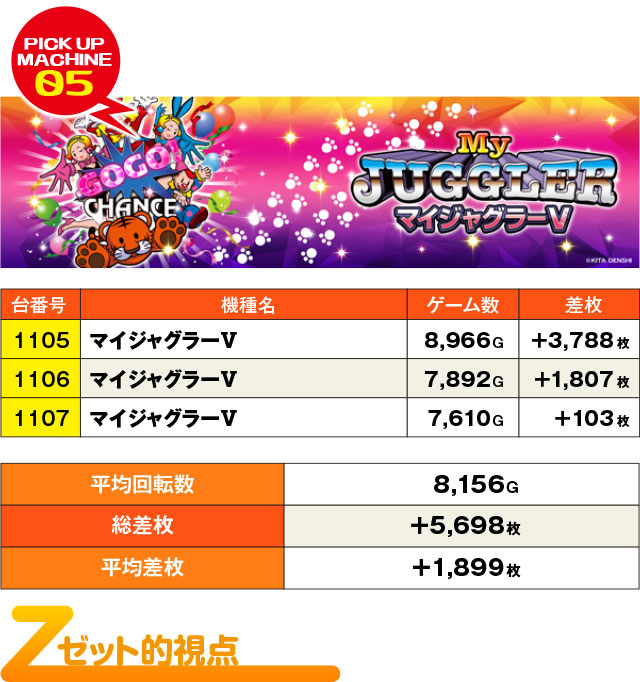 こちらの『マイジャグラーⅤ』では、1105番台が+3,500枚を突破。1105番台にはひっきりなしにボーナスが訪れ、+3,000枚を上回ったのも当然の結果だった。