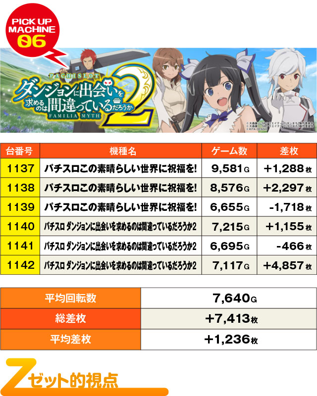 ともに3台設置の『パチスロこの素晴らしい世界に祝福を!』と『パチスロ ダンジョンに出会いを求めるのは間違っているだろうか2』。そして両機種ともに1台だけがマイナスとなっており、それぞれ+2,000枚超えと+4,500枚超えの優れた記録が誕生していた。これはもしや優秀台の6台並び、すなわち2機種とも全台系だった…!?