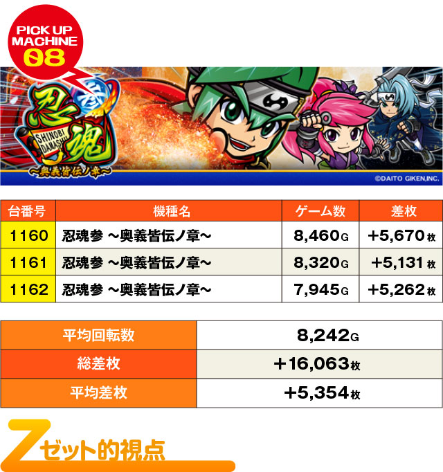 3台設置の『忍魂参 ~奥義皆伝ノ章~』は、なんと3台すべてが+5,000枚オーバーを達成!この結果を見て、全台系を疑わない人はいないと思う。
