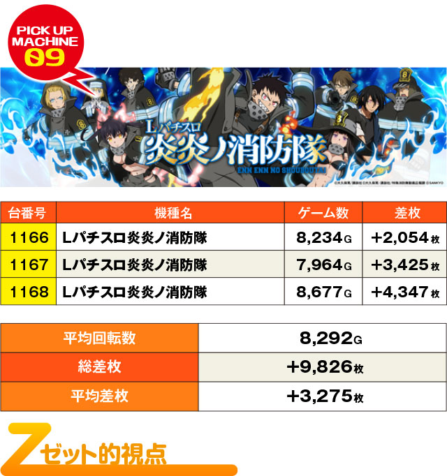 同じく3台設置の『Lパチスロ炎炎ノ消防隊』も3台そろってプラス結果。さらに3台とも+2,000枚超えを果たしていた。これも全台系と捉えるのが自然な結果。