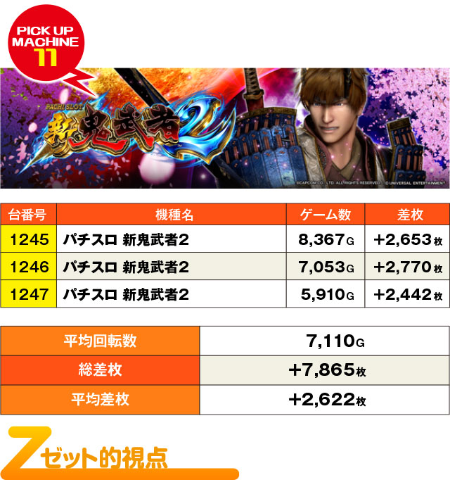 3台設置マシンの全台系疑惑は『パチスロ 新鬼武者2』にも。3台ともが+2,000枚をオーバーしていただけに、全台系を疑ってしまうのも仕方のないこと。