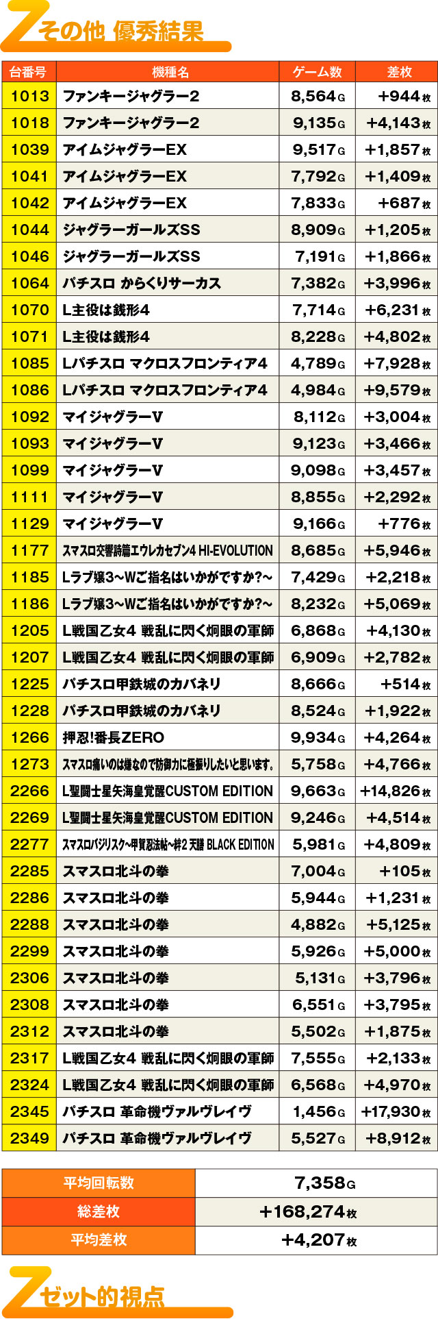 単品での優秀結果が非常に多かったこの日。もちろん7月7日効果もあったのだろう。単品での+3,000枚オーバー台が至るところから出現し、さまざまな機種から歓喜の声が漏れ聞こえていた。