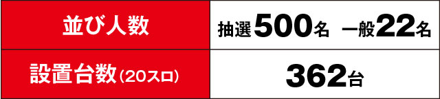 さすがは7月7日、朝から500人以上が並び、その並びに恥じぬ結果を多数生み出してくれた。いつもの優秀台の3台並びは言うに及ばす、この日は全台系と思える結果が多く、かなりの数の優秀台が七夕の日を彩ってくれたようだ。