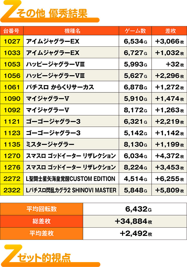 今回の対象台数は計53台。最近のREAL取材Zの中では少ない方だが、それでもその平均が2,000枚を超えていたのはさすが。また、今回もおなじみの優秀台の3台並びが多く確認され、加えて単品での好結果もあり。総じて参戦した方の満足度も高かったことだろう。