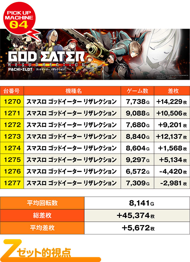 8台設置の『スマスロ ゴッドイーター リザレクション』は6台がプラスに。しかも8台の平均は5,672枚という衝撃的な数字。10,000枚超えが3台も生まれていたのだから、それもやむなし。全台が優秀台だった…?