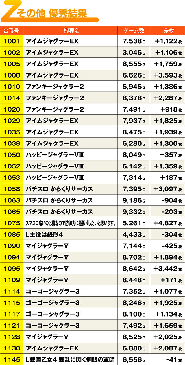 今回も単品での好結果が続出。残念ながら10,000枚超えは生まれなかったが、優秀台を確信するに十分な台が多かったようだ。また、台番に注目すると、やけに末尾⑤の台が多い気がする。これは偶然なのか、それとも…!?