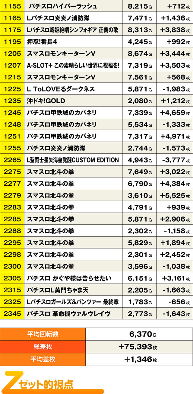 いつものREAL取材Zでは、優秀台の3台並びや全台系などの仕掛けが10コ以上確認できたが、この日は少なめ。それでも全台にチャンスがあったっぽい機種・3台並び・単品など、見どころは十分だった。そして久々に対象73台の平均が2,000枚を下回る結果に…!(それでもかなり凄い)