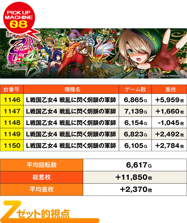 5台並びっぽい結果となっていたのは『L戦国乙女4 戦乱に閃く炯眼の軍師』。マイナスは1台のみ、平均は2,370枚。これはもう優秀台の5台並びでしょ…!