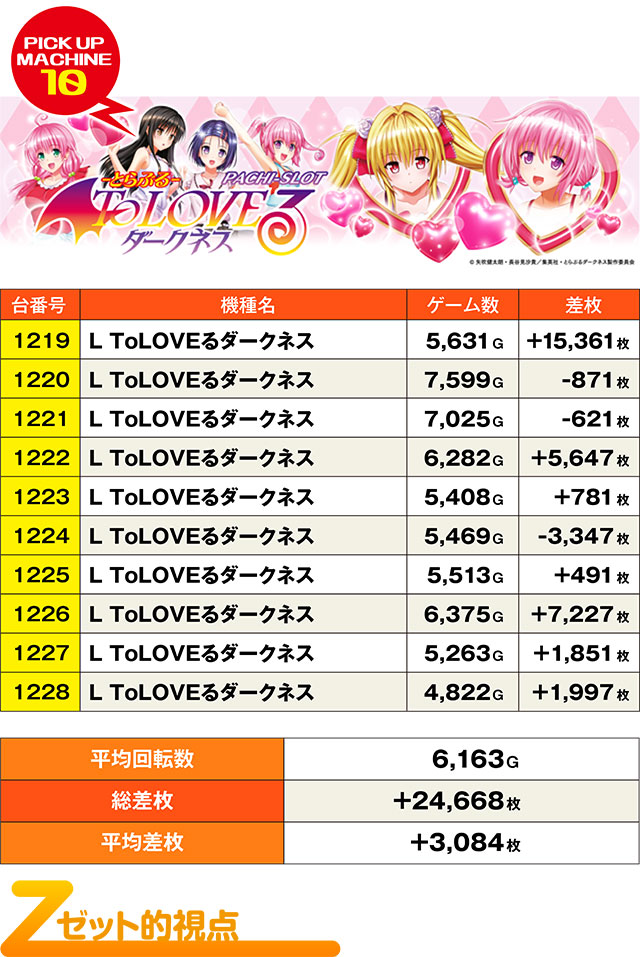 10台設置の『L ToLOVEるダークネス』にはプラス台多数!マイナス台は3台のみだった。また10台の平均は3,000枚を上回っており、もしかしたら全台が優秀台だったのかも…?