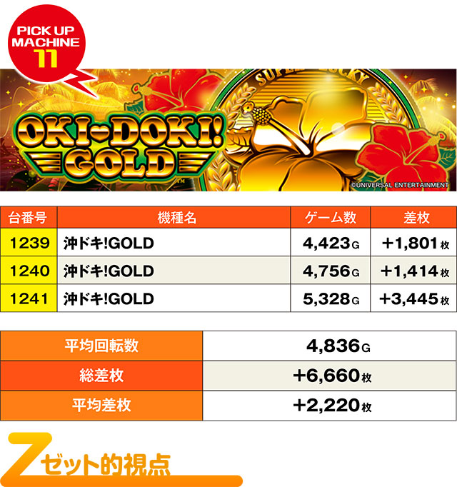 『沖ドキ!GOLD』でも3台並んでプラっている箇所を発見。特に1241番台のハイビスカスが咲き乱れており、終わってみれば3,000枚超え!