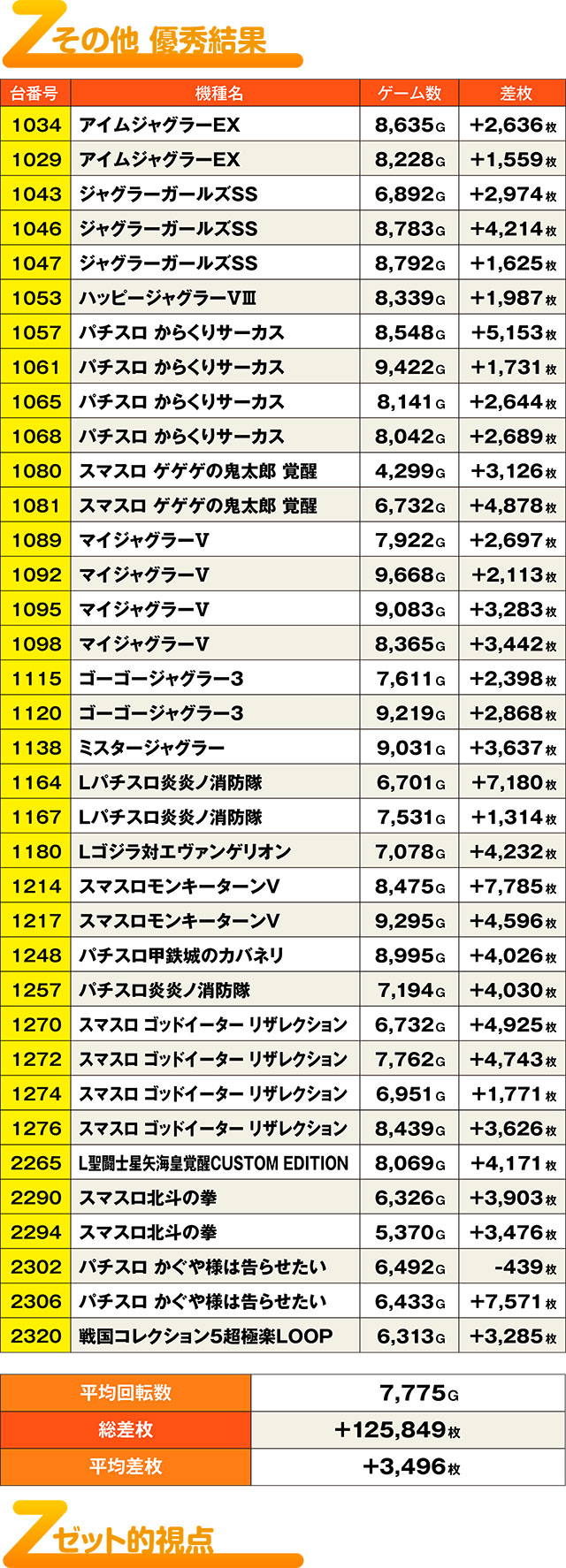 もちろん今回も単品での好結果が続出した。さまざまな機種からプラス差枚が生まれ、特に常連さん人気の高い台は複数台から好結果が生まれていたようだ。