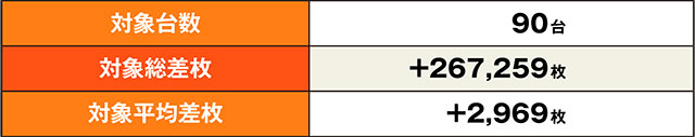 今回の対象台数は計90台。そしてその平均は3,000枚に迫る数値となっていた。またパチスロコーナーにはいつも通りの優秀台の3台並びが多発していたが、いつもとは異なり、この日は機種またぎでの優秀台の3台並びもいくつかあった。さらには全台が優秀台っぽいムーブを見せていた機種や単品など、今回も多くのチャンスが存在していたようだ。