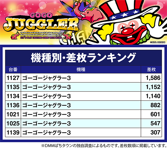 「ゴーゴージャグラー3」も多くの台が結果を残しており、1,500ptを超えた台もアリ。