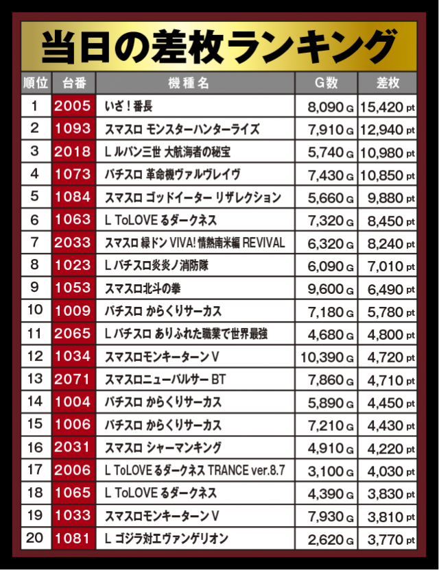 この日のSAPグループはひと味違う。DMMぱちタウンは、「SAP立川店」の特別なひとときを一斉取材した。特に華々しい活躍を残した機種たちをピックアップして紹介しよう。まずは差枚ランキングの発表だ!