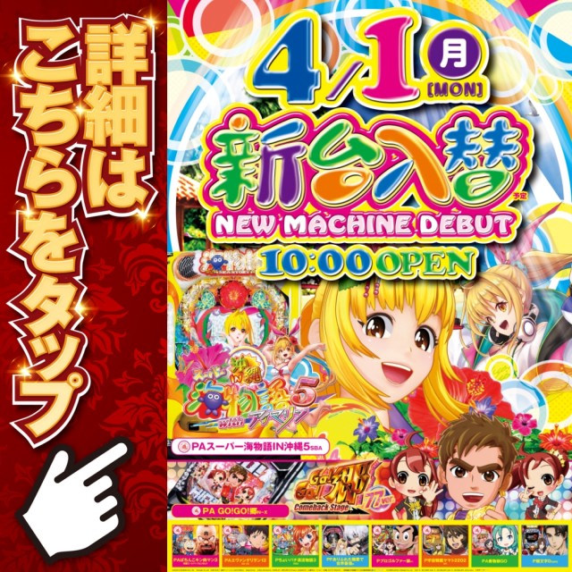 4月8日(月)10時オープン!! 本日新台入替初日(予定)♪