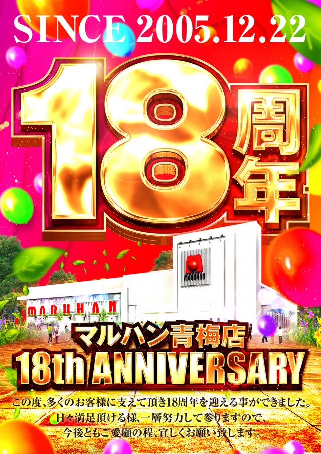 【マルハン青梅店】ついに18周年!ご来店お待ちしております!