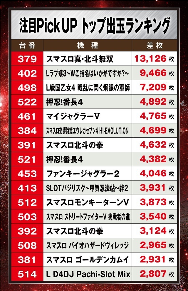 この日はスマスロを中心に様々な機種で好調台を確認、+3,000枚超の台が大量発生する大盛況な一日となった。そんな中、出玉ランキングトップに輝いた『スマスロ真・北斗無双』では万枚超の+13,126枚という圧巻の記録を残している。