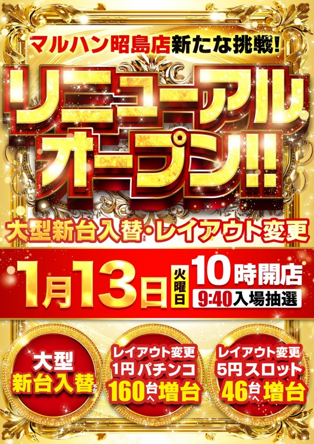 1月13日(火)リニューアルオープン!【大型新台入替予定】