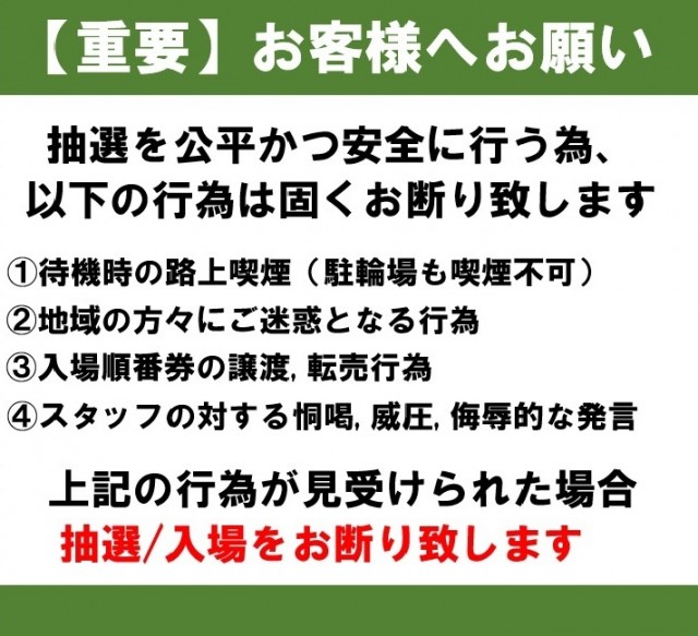 毎日9:20より正面入口にて抽選参加を配布、9:30から入場の順番を決める抽選を行っております! |