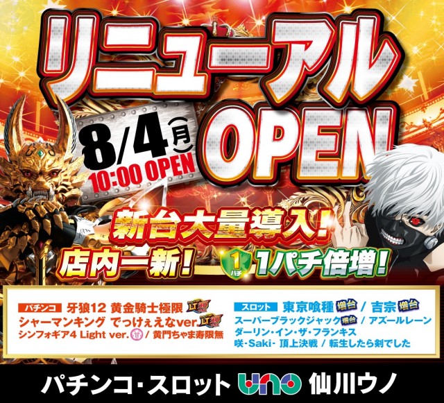 8月4日 リニューアルオープン 新台大量導入 1パチ倍増!