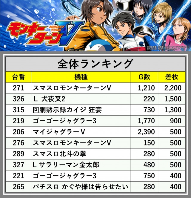 厳選された取材対象機種をはじめ、その他スロット全体から好記録が飛び出した!プレイヤーが楽しんだ1日を下記データにて振り返ってみて欲しい。