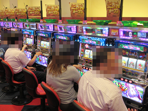 15時頃の1000円/48枚パチスロをみると、AT・ART機では新機種の「パチスロBLOOD+ 二人の女王」や「沖ドキ!」が盛況。明るい表情で遊技を楽しんでいるプレイヤーが多く、華やかな光景が広がっていた。