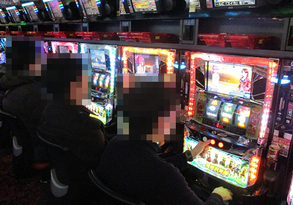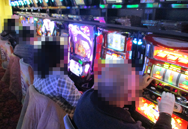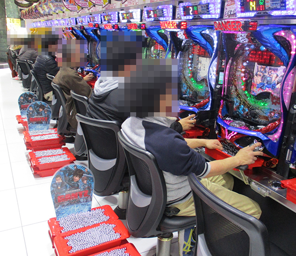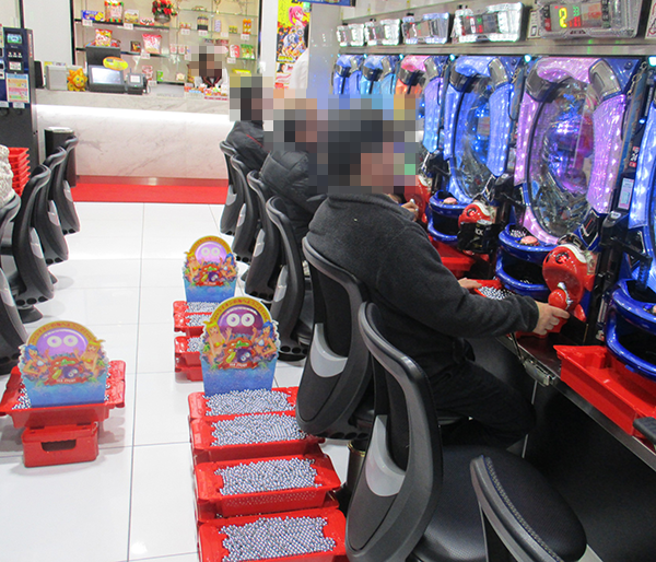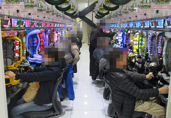 100円/96玉パチンコをみると、空き台を探すのがむずかしいほど、たくさんのプレイヤーでにぎわっていた。