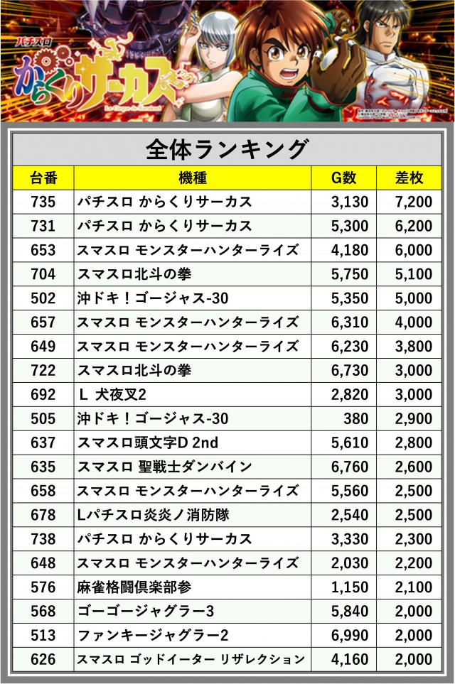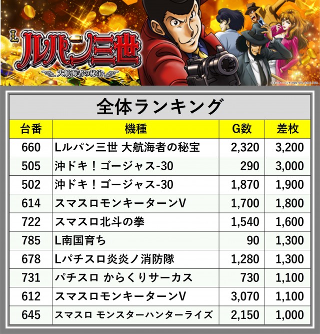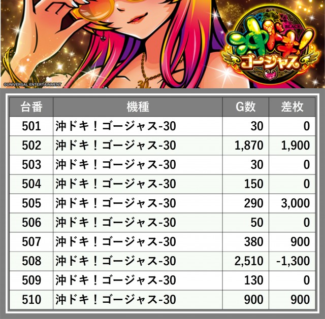 厳選された取材対象機種をはじめ、その他スロット全体から好記録が飛び出した!プレイヤーが楽しんだ1日を下記データにて振り返ってみて欲しい。