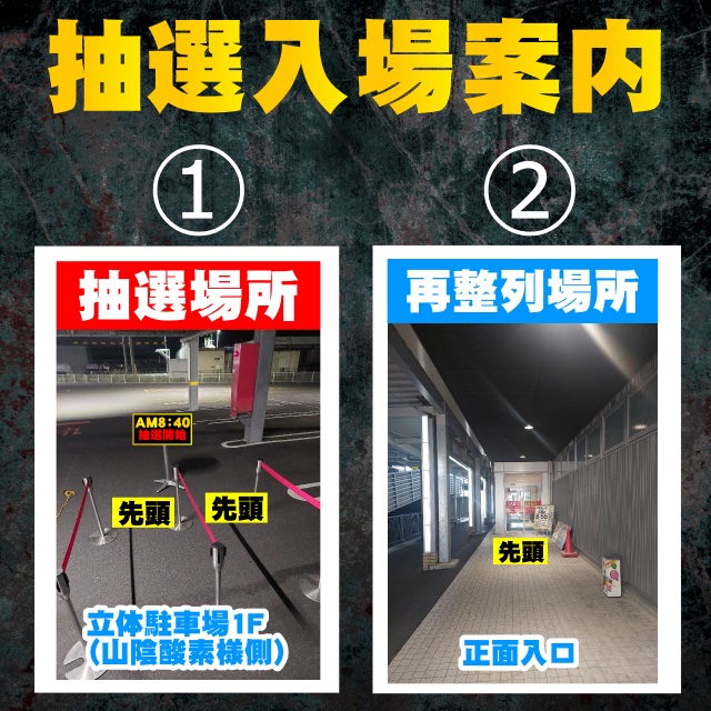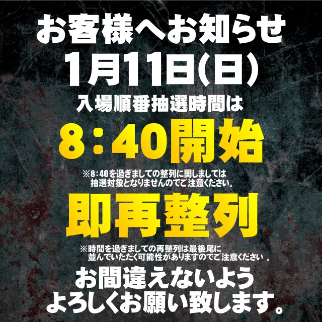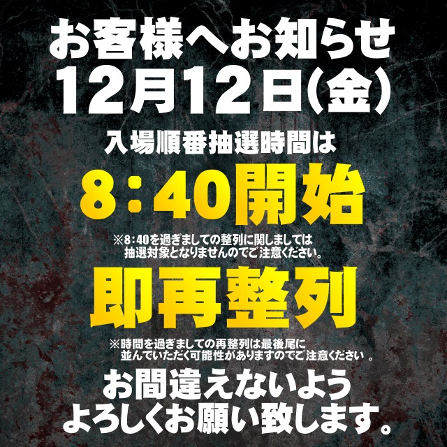 当店は入場順番抽選方式です。抽選開始8:50 再整列は抽選後即行います。 ※不定期で抽選時間が変更になる事もございます。 その際は最新情報にてご案内致します。 |