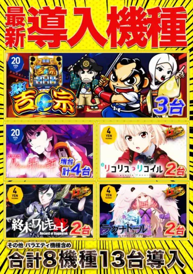 4月7日(火)BOSSニャンギラス新装開店!最新台8機種13台導入!朝の抽選は8時50分より開始!ぜひご来店をお待ちしております!