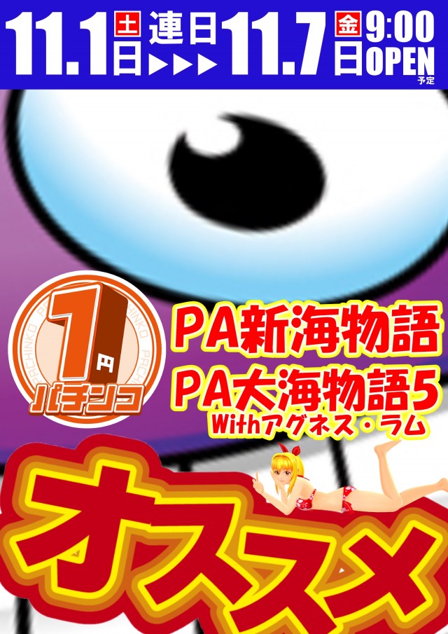 11.1(土)~11.7(金)1円パチンコ海物語に注目!!