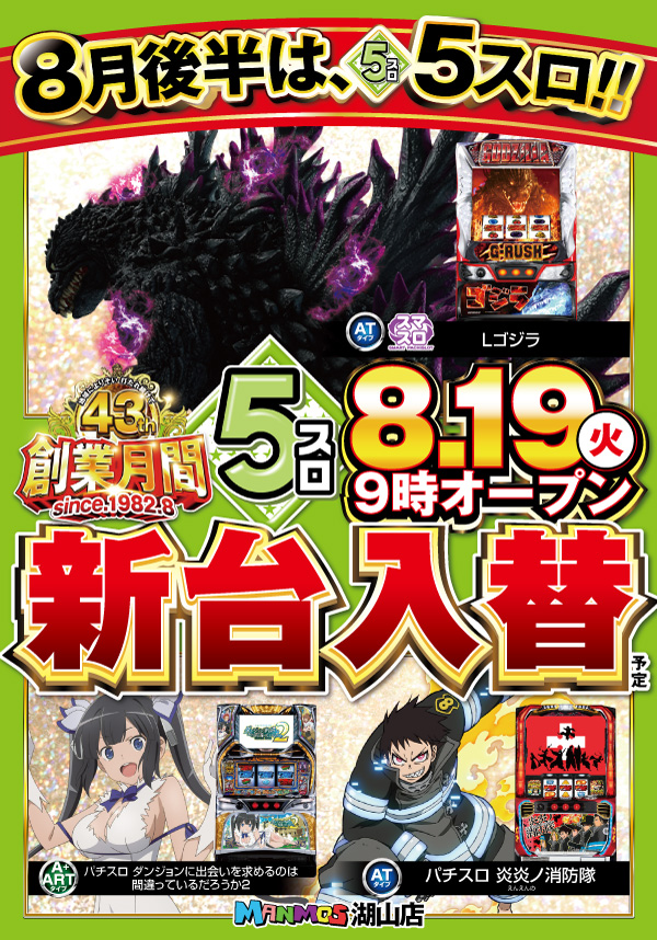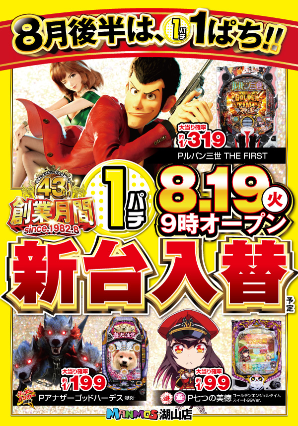 ★新台入替★8月19日(火)1円パチ&5円スロ新登場オープン