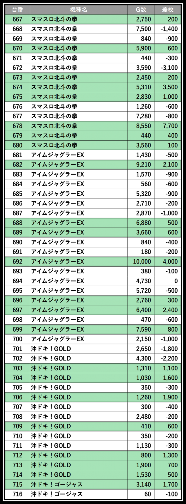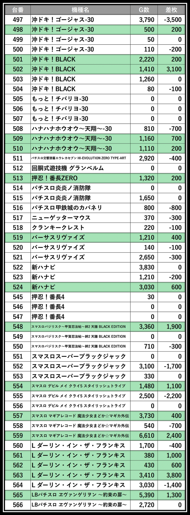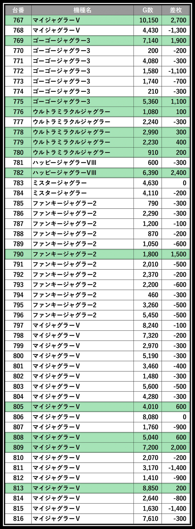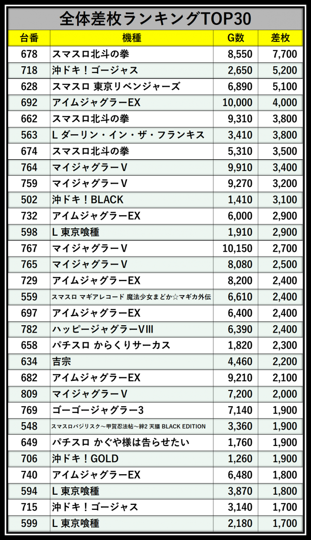 ※差枚数順に掲載しています