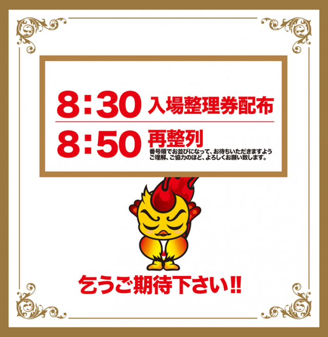 8:30並び順で入場整理券配布。8:50再整列。9:00入場開始。 |
