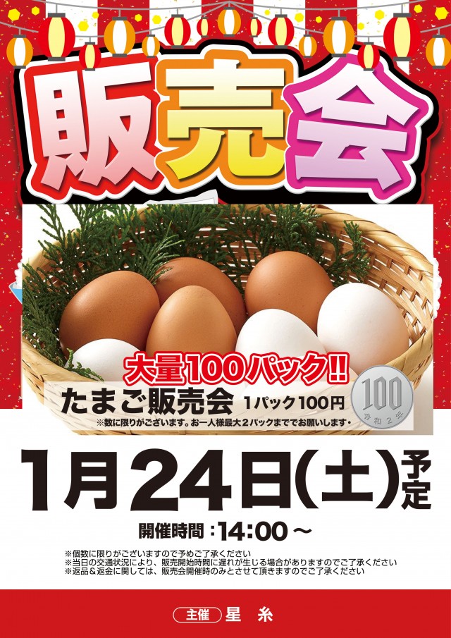 大好評のたまご販売会開催!!大量100パックご用意!!
