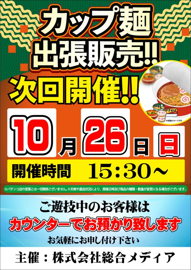 本日カップ麺の出張販売開催!全館9時オープン!