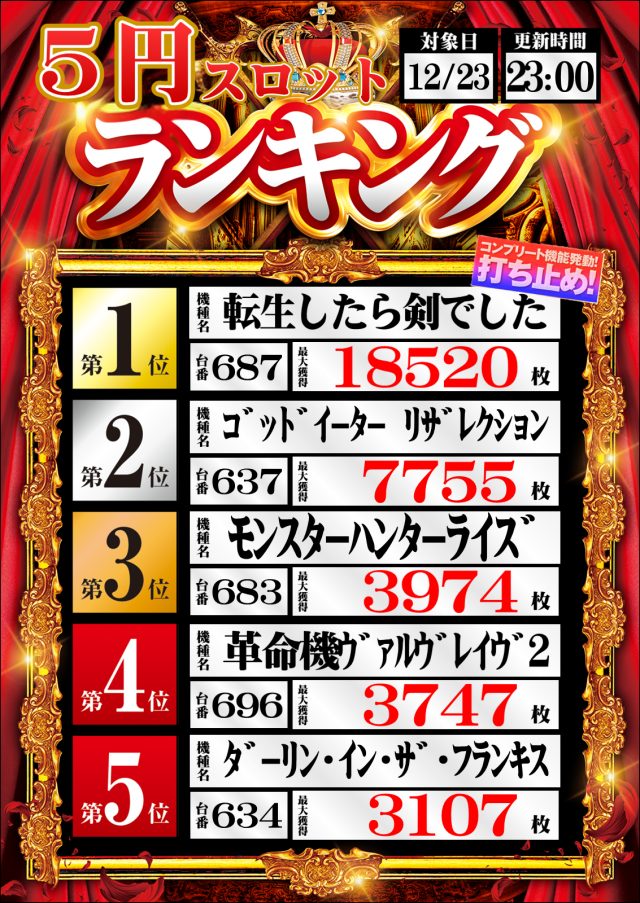 9:00~23:00(遊技終了22:45) |