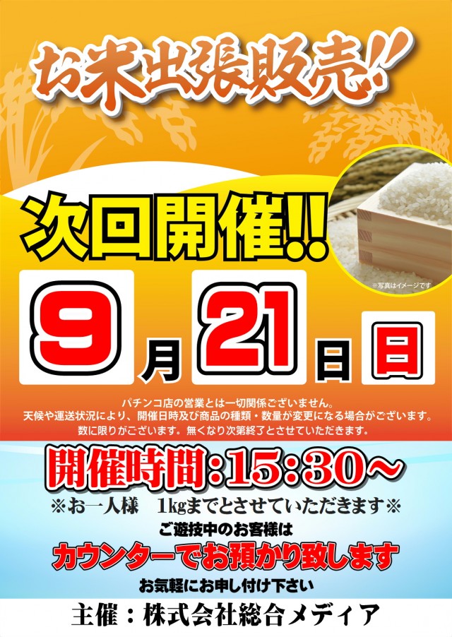 明日お米の出張販売開催♬ 主催:株式会社総合メディア