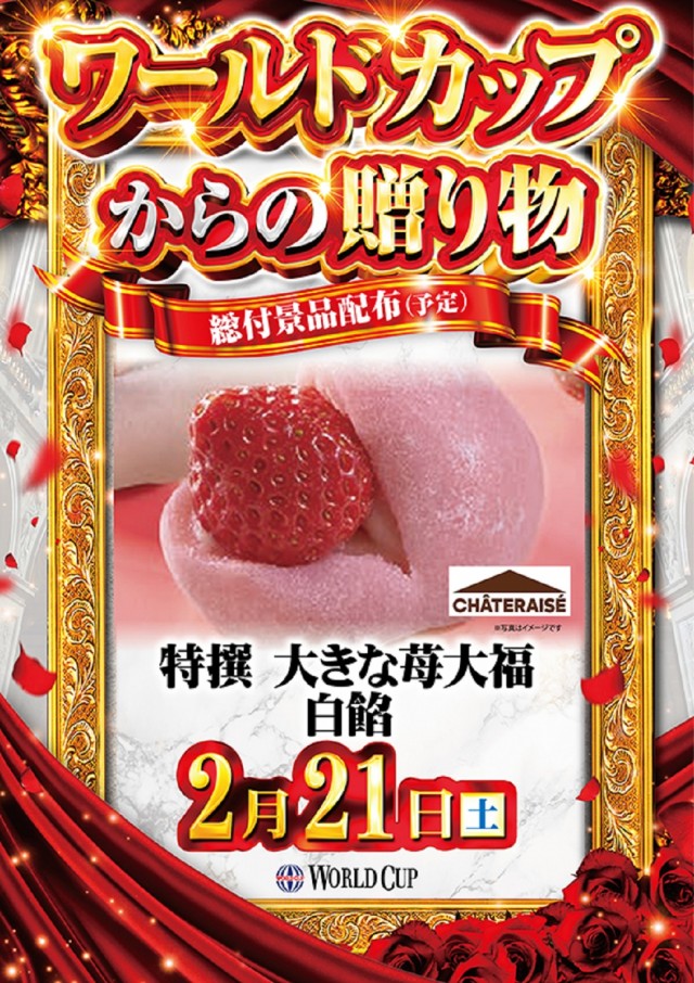 このあと15時ごろより「総付景品 特選苺大福」お配りします。
